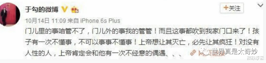 虽然郭德纲没说什么,但董事长于勾可没惯着曹金的毛病,立马发文:“上帝想让其灭亡,必先让其疯狂,对没有人性的人,上帝肯定会和他有一次不经意的偶遇”,于勾几句话掷地有声,那意思就是告诫曹金,做人别太猖狂,不然保不齐自己哪天就丢了小命上去见上帝了。