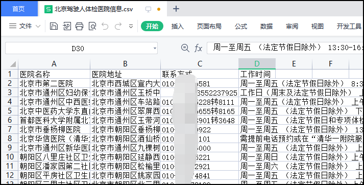 首先从官方公布的网页信息中,我将可以体检的医院相关数据复制到“北京驾驶人体检医院信息.csv”中,具体详情如下图所示。