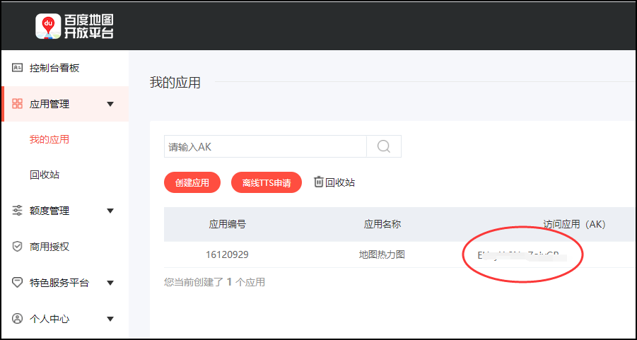 打开百度地图开放平台的网址后(),点击控制台,然后激活个人开发者账号才能申请自己的免费密钥,这样才能完全使用该API。注册成功之后,就可以在开放平台上点击“创建应用”,填写相关信息后即可获得自己创建应用对应的密钥,如下图红圈标注所示。