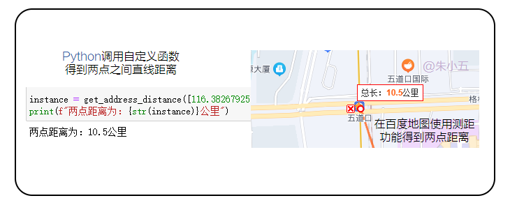 同样,我们也可以使用Python自定义函数去计算两个坐标点之间的距离。那么,这里同样在北京地图上随便选两个地点,分别用【Python自定义函数】和【手动】的办法,验证一下。