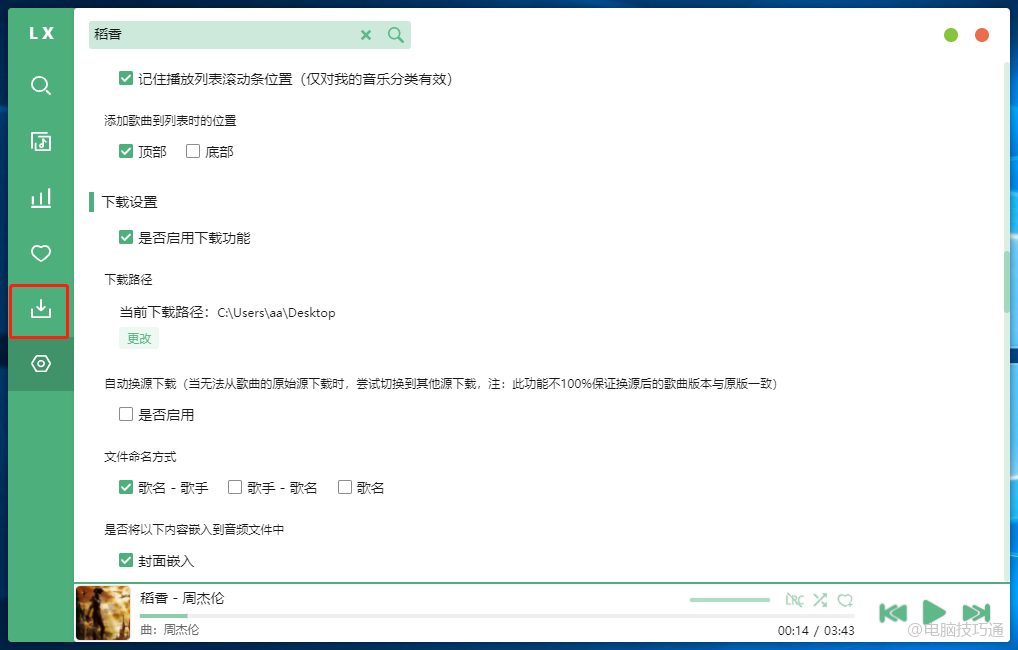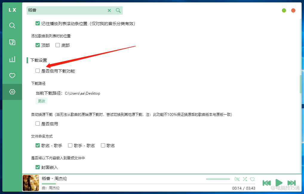 如果需要下载歌曲的话,在设置中勾选‘启用下载功能’就可以下载了