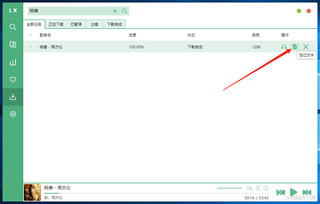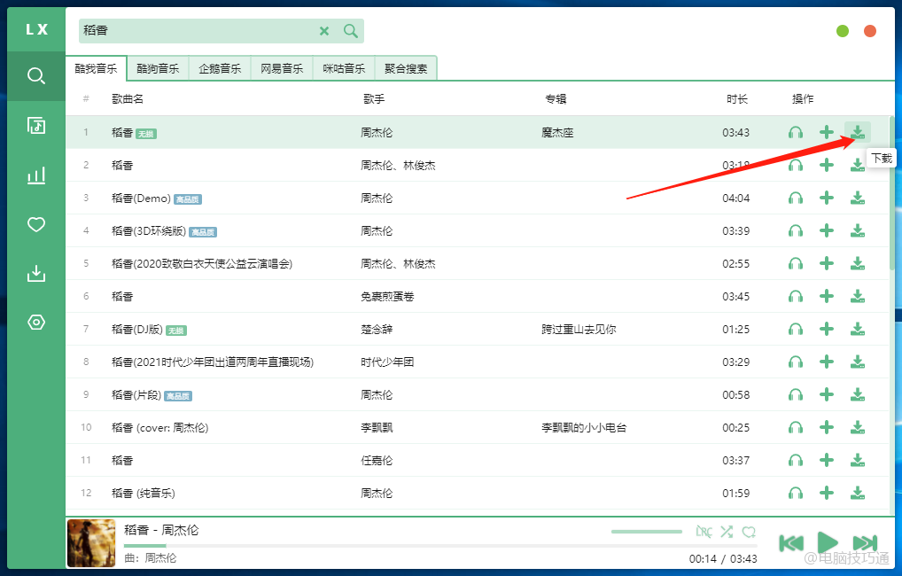 再回到搜索结果,点击下载按钮,就可以把相应的音乐下载下来了
