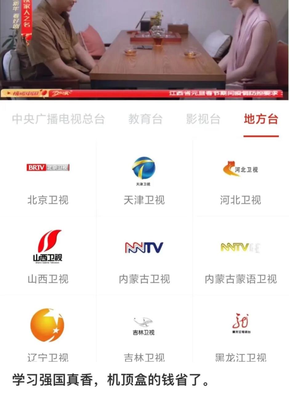 有人给爷爷的手机里下载了“学习强国”app,在上面可以免费看各种电视剧,还有各地的电视台,全程绿色无广。