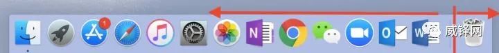 再回来说 Dock 哈,除了最左的 Finder 和最右的废纸篓,其它程序应用都是可以在各自的区域移动的,方法依然是简单易操作的“拖”。给大家举个例子:
