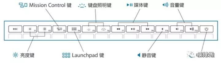 首先,在一些 Mac 键盘的顶行部分会有一些特殊功能的键盘,表示音量调节,亮度显示等: