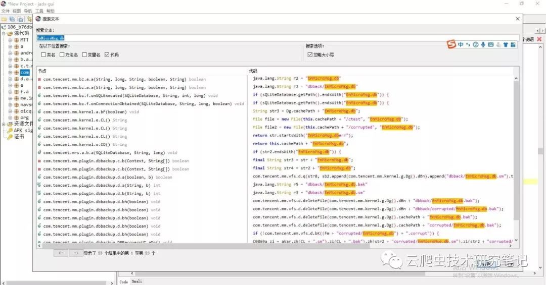 那我们该从哪里入手呢?相信大家百度搜索Hook微信的时候都会搜到一类内容,就是如何解密微信本地的数据库,而微信在我们手机上的存储位置又有一个关键词–EnMicroMsg.db,这个就是我们的入口搜狗微信文章,我们需要在微信源码中全文搜索这个词,我们使用的微信是6.5.3,工具是Jadx,实际操作如下