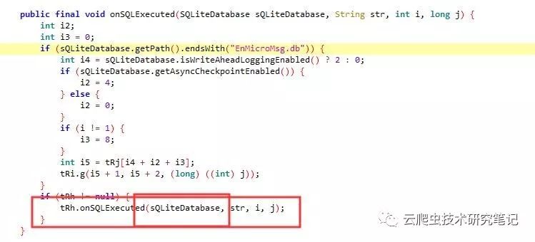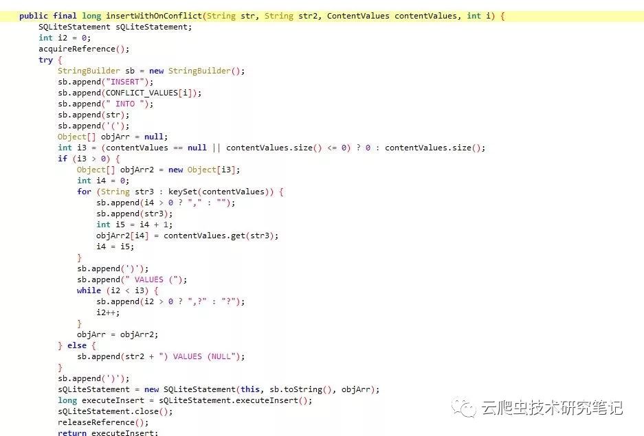 好的,我们跟到这里能够看到很直观的Sql语句拼接的过程,那么这个方法的参数应该是我们收到的消息的值,只要Hook这个方法,我们就可以去拿到插入数据库时的值了。