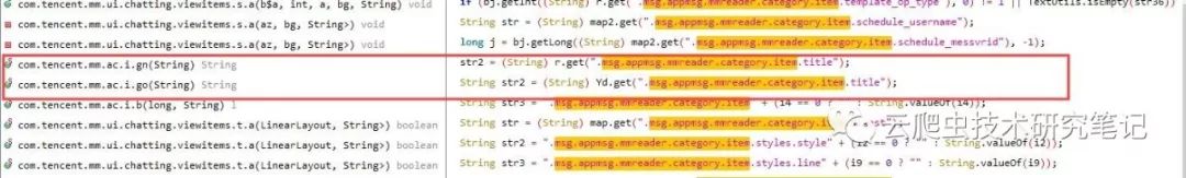 我们再根据刚才的逻辑,全文搜索msg.appmsg.mmreader.category.item,之后我们一个个分析,看到下面这个部分,跟进去