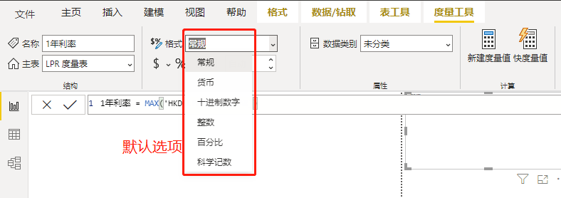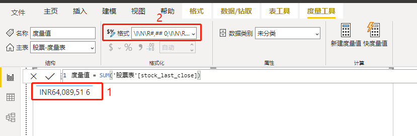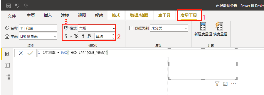 一般来说,在Power BI Desktop中编写度量后(按Enter键),你将进入下面的“度量工具”菜单(步骤1)。从那里你将在编辑栏中看到度量(步骤2),然后可以在其中格式化度量(步骤3)。
