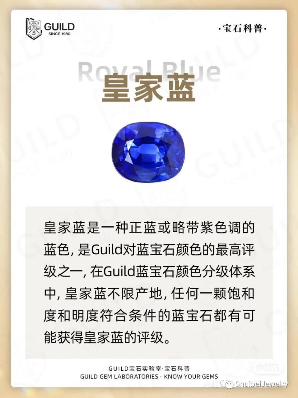 皇家蓝是一种正蓝或略带紫色调的蓝色,是Guild对蓝宝石颜色的zui高评级之一颜色名称大全,在Guild蓝宝石颜色分级体系中,皇家蓝不限产地,任何一颗饱和度和明度符合条件的蓝宝石都有可能获得皇家蓝的评级。