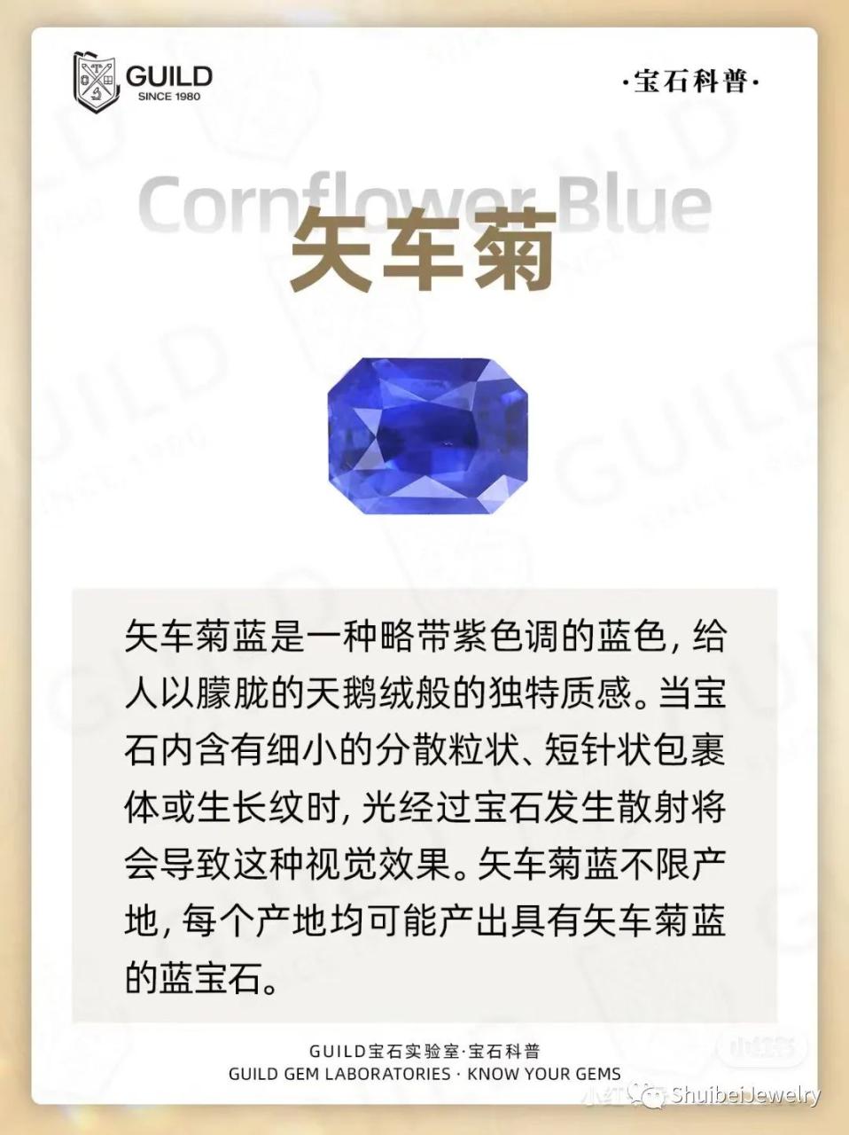 矢车菊蓝是一种略带紫色调的蓝色,给人以朦胧的天鹅绒般的独特质感。当宝石内含有细小的分散粒状、短针状包裹体或生长纹时,光经过宝石发生散射将会导致这种视觉效果。矢车菊蓝不限产地,每个产地均可能产出具有矢车菊蓝的蓝宝石。