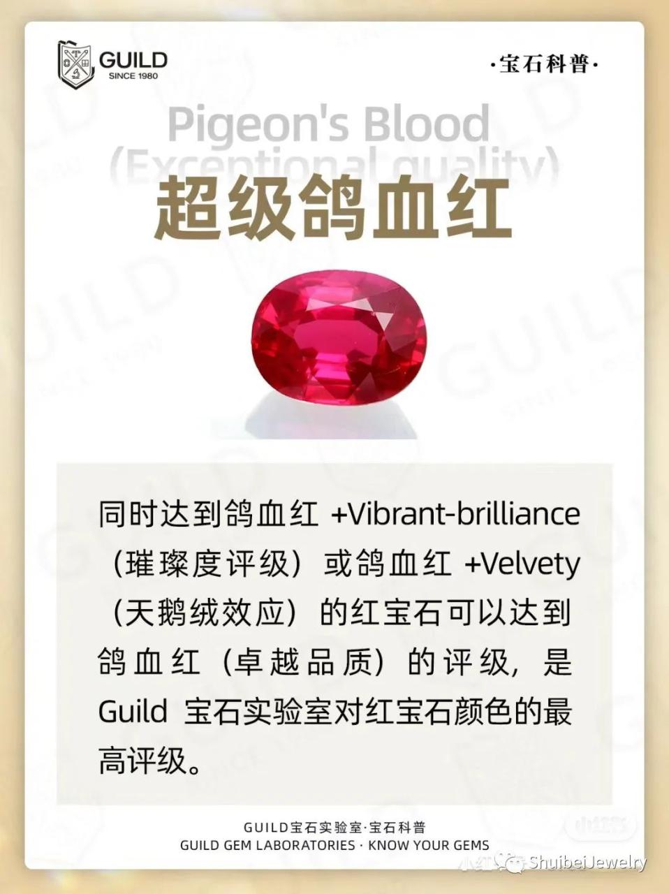 同时达到鸽血红+Vibrant-brilliance(璀璨度评级)或鸽血红+Velvety(天鹅绒效应)的红宝石可以达到鸽血红(卓越品质)的评级,是Guild宝石实验室对红宝石颜色的zui高评级。