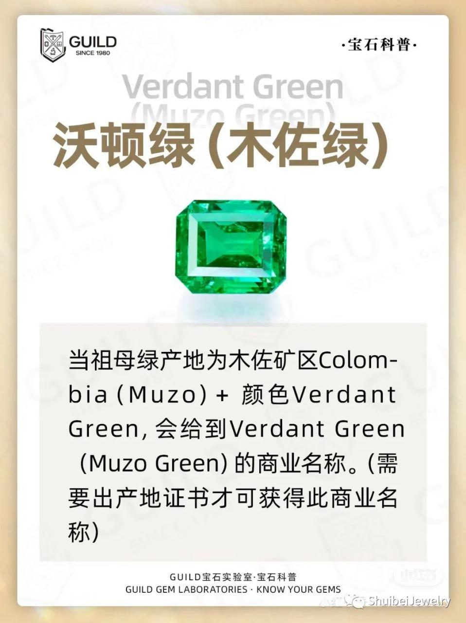 当祖母绿产地为木佐矿区Colombia(Muzo)+ 颜色Verdant Green,会给到Verdant Green(Muzo Green)的商业名称。(需要出产地证书才可获得此商业名称)