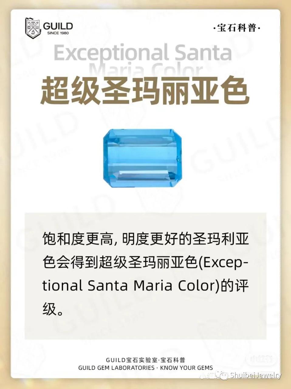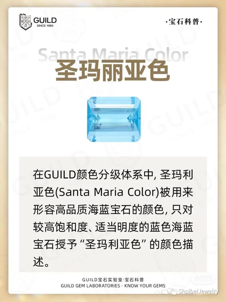 在GUILD颜色分级体系中,圣玛利亚色(Santa Maria Color)被用来形容高品质海蓝宝石的颜色,只对较高饱和度、适当明度的蓝色海蓝宝石授予“圣玛利亚色”的颜色描述。