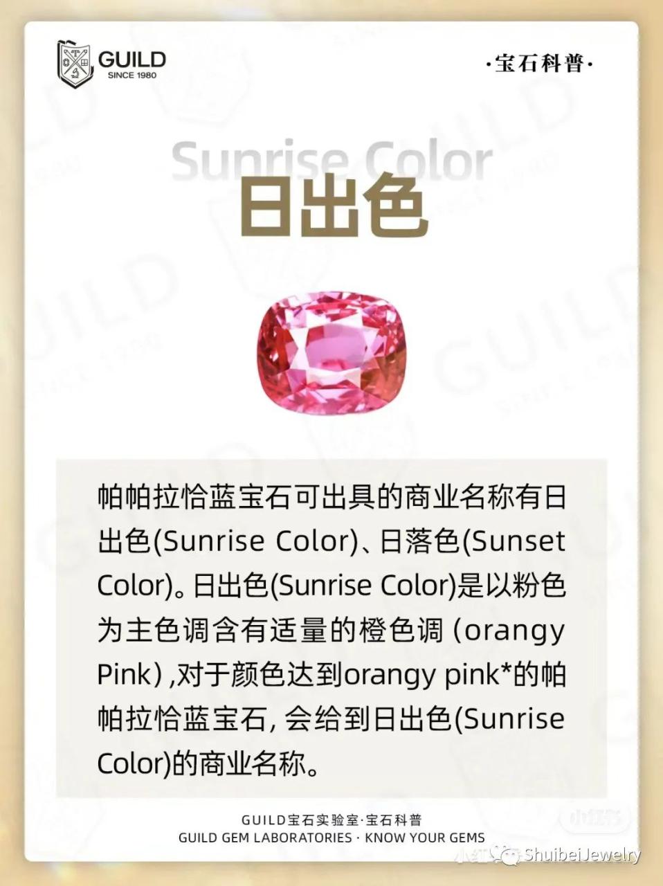 帕帕拉恰蓝宝石可出具的商业名称有日出色(Sunrise Color)、日落色(Sunset Color)。日出色(Sunrise Color)是以粉色为主色调含有适量的橙色调(orangy Pink),对于颜色达到orangy pink*的帕帕拉恰蓝宝石,会给到日出色(Sunrise Color)的商业名称。