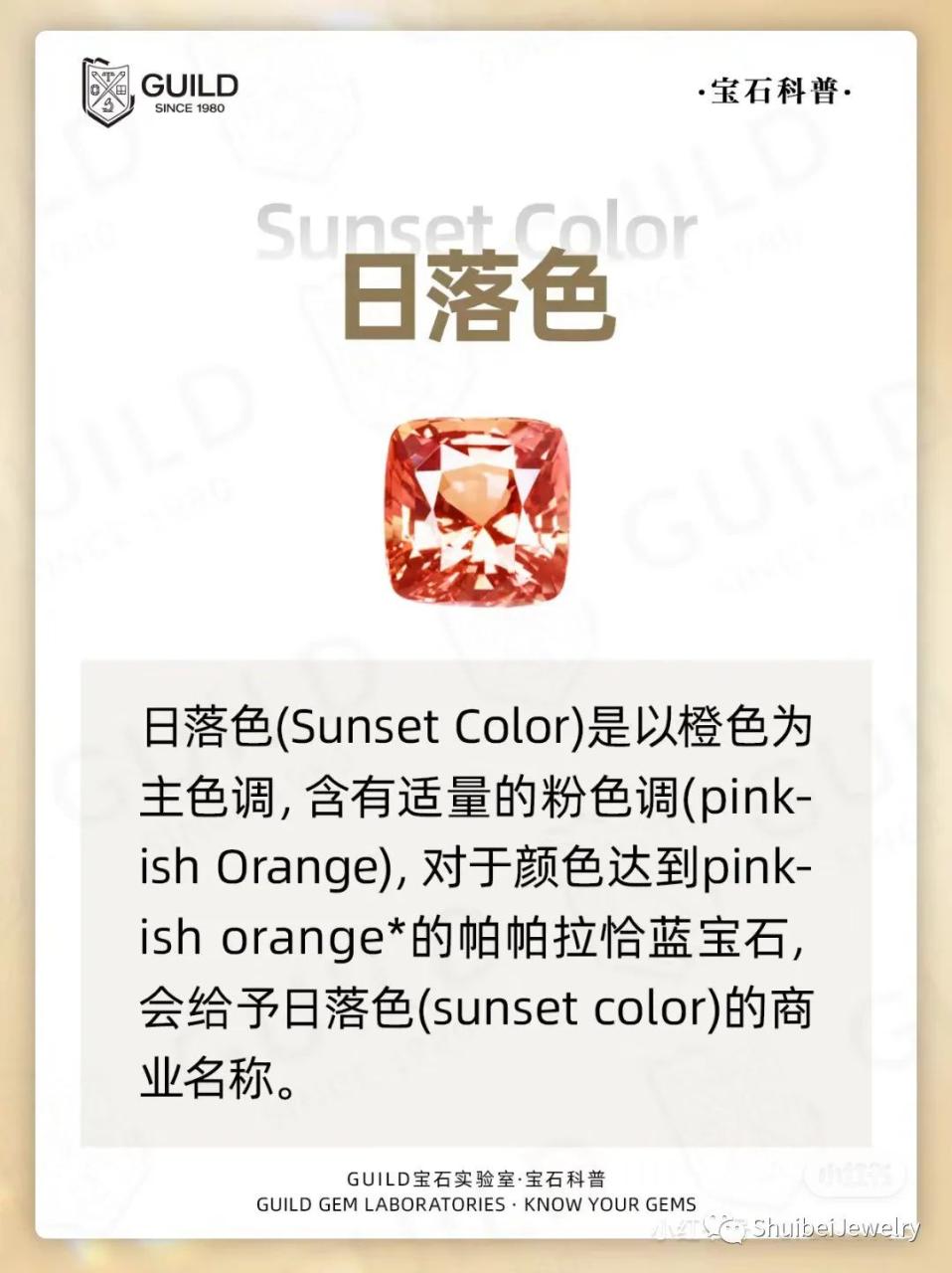 日落色是以橙色为主色调,含有适量的粉色调,对于颜色达到pinkish orange*的帕帕拉恰蓝宝石,会给予日落色的商业名称。
