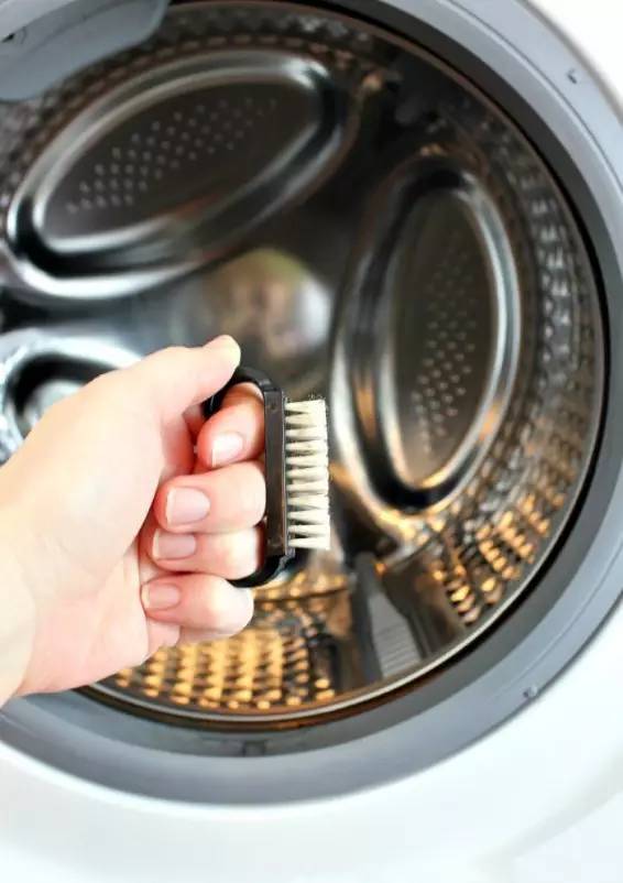 2、用毛刷蘸取精油和白醋的混合体,围绕洗衣桶刷洗一圈,可以来回多刷洗几次。