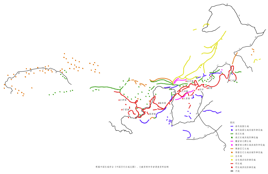 时间跨度大致以学术界较为一致认为的长城起始阶段,即春秋战国为起点,直至清代。但因关隘、烽火台等的出现早于春秋战国时期,之后与长城防御体系形成有机结合,故记述的起始时间并没有明确年限,而是在表述其建筑单元的发展过程中有所提及。另因明代是中国长城发展的成熟阶段,留存的遗存量最大,故对明代长城建筑特征的记述更为详细。