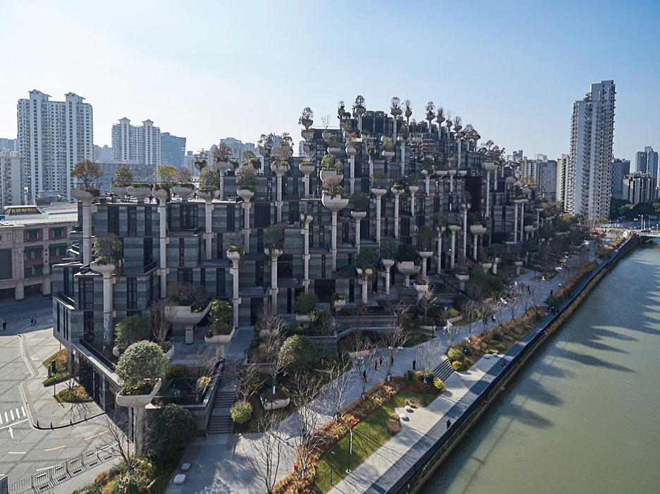 这一大型商业综合体建筑高约60米,设有地上9层及地下3层。约1,000根清水混凝土“花盆柱”拔地而起,从地面一直延伸至建筑顶端千的结构,打造出独特的建筑风貌。建筑围护结构逐层后退,在视觉上创造了两座覆盖着绿色植被的山脉,宛如交融于周边环境的城市“绿岛”。