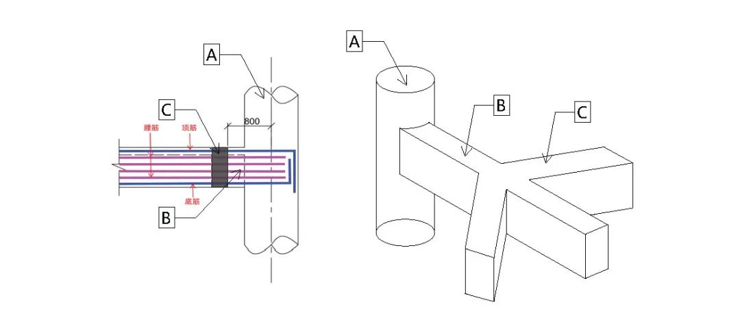 此外,外露柱与正交的弯矩梁网格成45°角,这使得梁柱接头处的钢筋特别密集。团队采用圆形结构柱,简单而有效地解决了这一设计难点。同时,我们通过特殊的“外饰”帮助形成45°的视觉效果。