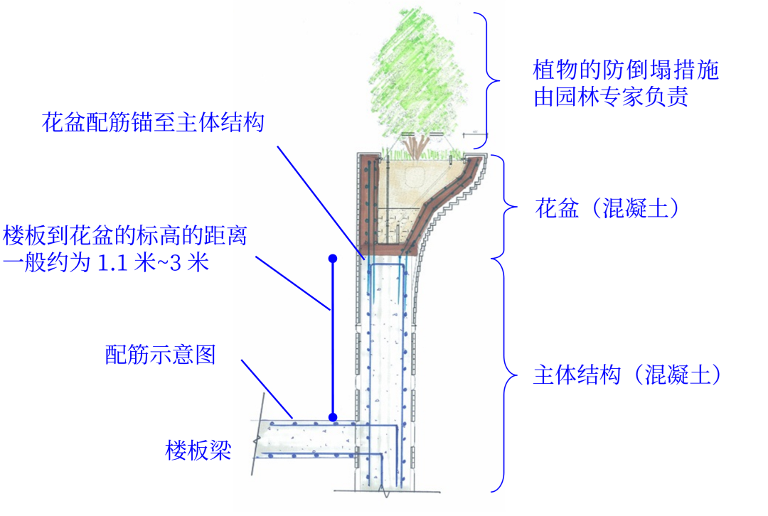 整个项目最引人注目之处,无疑是其布满开放式露台的近1,000棵绿植。这些郁郁葱葱的花盆虽不属于结构抗侧体系,但其体积和重量约占建筑总量的4%,这使其成为建筑设计和细部设计的重要组成部分。