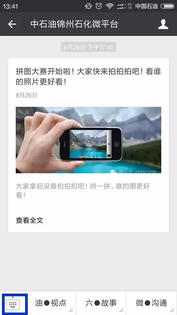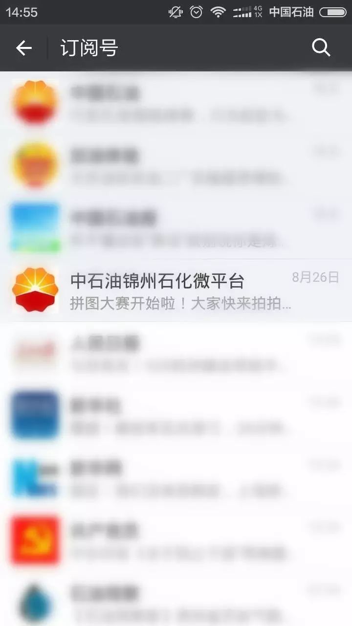 如果你已经关注了中石油锦州石化微平台,进入微信的订阅号界面,看到的是下图酱紫滴,点击“中石油锦州石化微平台”,就能进入对话界面啦!