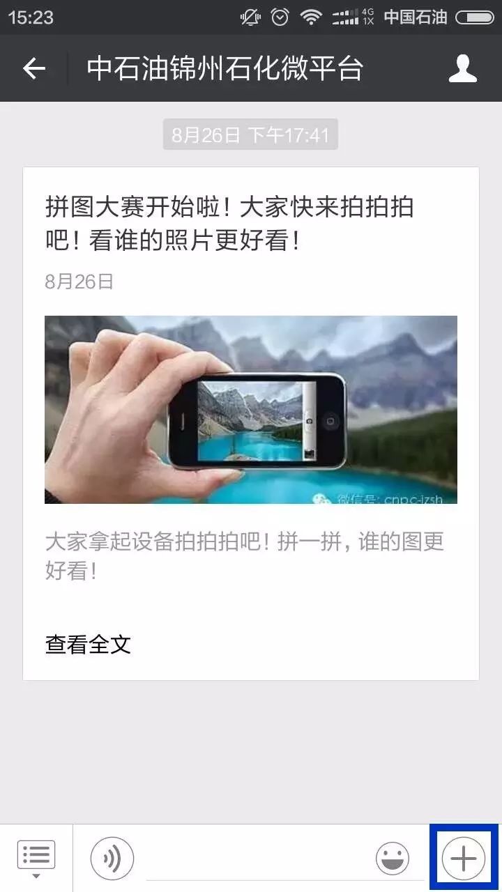 这个界面和微信正常对话是一样的,这时候就可以给微信公众号发文字信息啦!如果想发照片咋办呢?就点击右下角蓝色框框里的“+”,会出现下面的界面: