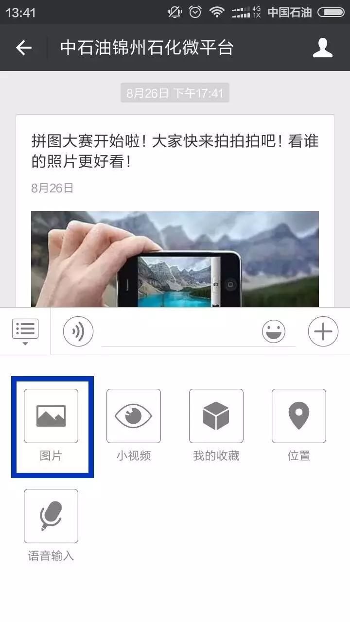 点击蓝色框框中标识出来的“图片”标志,就可以向微信公众号后台发送手机里的图片啦!小编就能看见啦!就像你与朋友聊天时一样微信互传网页版,是不是很简单呢?