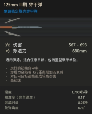 99式的125mm主炮即便实战中只是用“尾翼稳定脱壳穿甲弹”从头打到尾,凭借567-693的单发伤害,在没有伤害加成的情况下,也能对血量较少的脆皮坦克造成很大的威胁,而680mm的穿透力以及简单粗暴的击穿方式对付复合反应装甲的主战坦克也非常好用,真正做到了适用于任何目标。