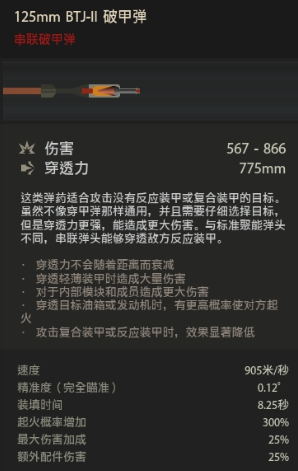 如果你对AW的装甲和穿深有一定的了解,那么实战中更加推荐你穿甲弹和破甲弹切换使用,99式所发射的“串联破甲弹”伤害要远高于穿甲弹,最高可以爆到866的伤害,同时再配合上25%的最大伤害加成和300%的起火概率,对于脆皮坦克来说简直就是噩梦;虽然面对装配复合反应装甲的主战坦克威胁不大,但面对仅装备了钢装甲的坦克时775mm的穿透力也完全够用,如果你能在保证击穿的情况下大量使用破甲弹,那么你的输出会比全程穿甲弹的玩法要高得多。