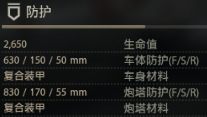 99式的防护能力,尤其是面对破甲弹、导弹时的防御力比较高,车体正面和炮塔正面才用的都是630mm和830mm的复合装甲,但主要问题出在2650的血量上,实在是有些少,和同级其他主战坦克3000+的生命值实在比不了,哪怕是T-90A都有2900的血量。