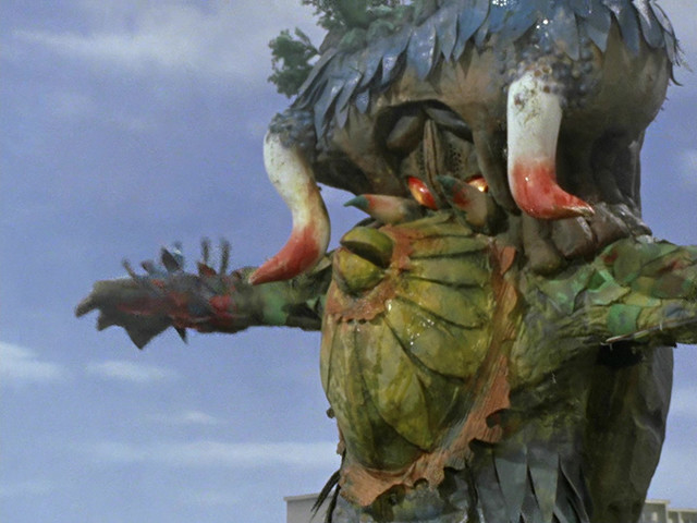 其中第三话出现了超级强悍的怪兽,也就是上面左图的怪兽,左图的怪兽是三头怪兽贾戈尔贡;它实际上有三个头,中间一个,然后两边的两只手还有两个头,看起来非常的霸气;不过总体上来说它是这几个怪兽中最强悍的,因为它的技能是“石化光线”,被它击中的东西会石化,而第四话出现的怪兽就是我们的老牌怪兽了,其实这不就是我们的“雷德王”吗?