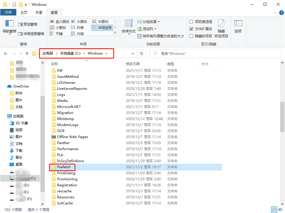 ③C/Windows/Prefectch 文件夹:是系统的预读文件夹,主要存放系统已访问的文件预读信息,创建此文件夹主要是为了加快系统启动过程,但时间越长预读信息越多,就会占用电脑的存储空间,所以可以定时清理。
