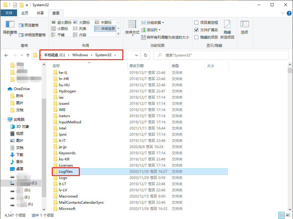 ④C/Windows/System32/Logfiles 文件夹:记录的是系统和软件的处理记录,如果觉得不用可以删除清除c盘缓存文件,但是删除的时候不要删除文件夹本身,清理里面的文件就好。