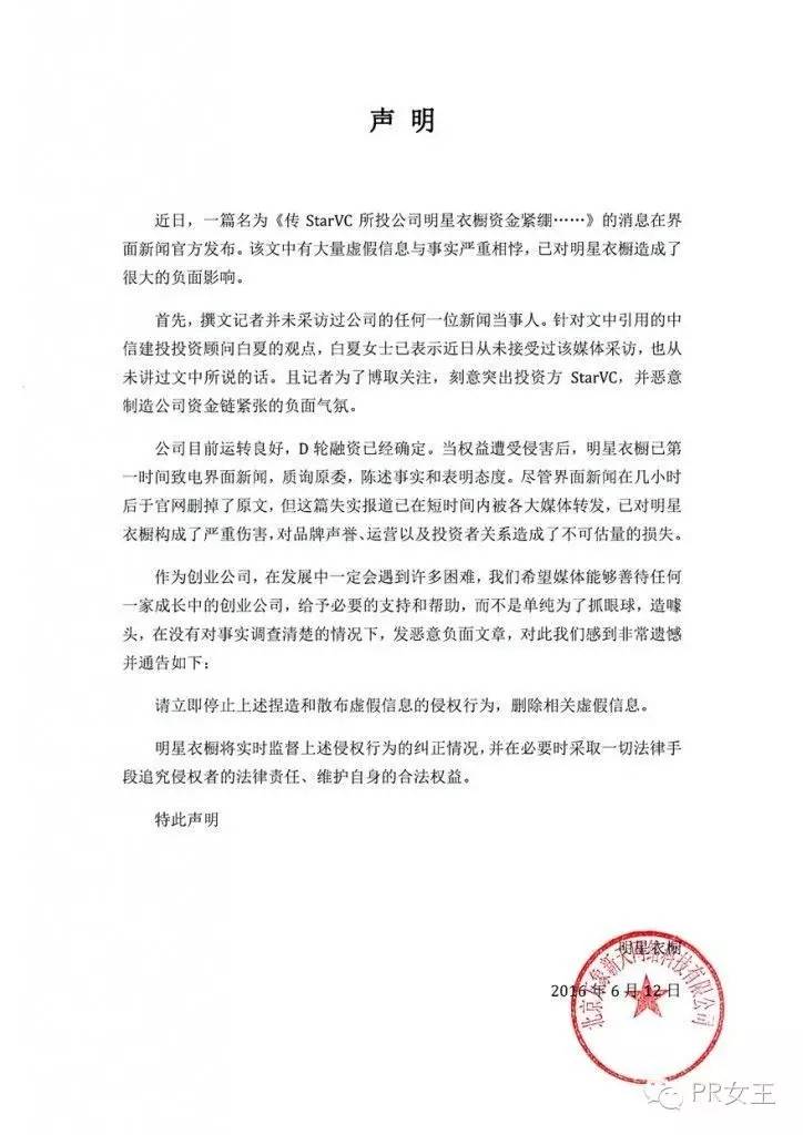 6月12日,界面的记者方同学发表了一篇名为《Star VC参投的跨境服饰电商明星衣橱资金链紧绷 D轮融资恐无人接盘》的文章,称获得爆料,服饰电商创业公司“明星衣橱”拖欠员工工资,估值过高,商业模式存疑,前景不容乐观。