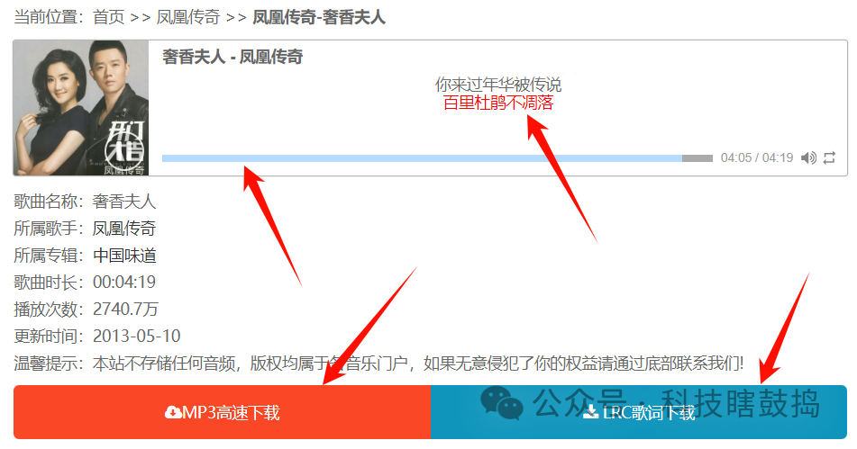找到歌曲后,可以直接在线欣赏歌曲,上栏是动态歌词;也可以下载歌曲和LRC歌词,很人性化。