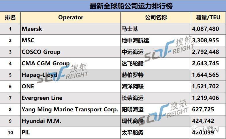 截止2019年1月31日,最新船公司运力排行榜前20强榜单如下: