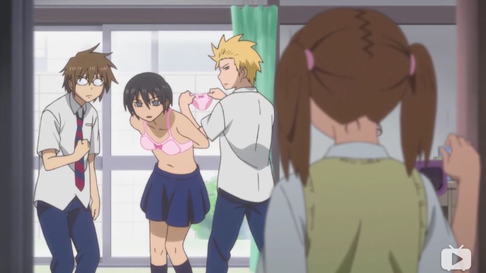 本来就是一张中性的脸,经常担任吐槽的角色,想必穿个裙子也不会怎么样的。结果后面穿妹妹的有点不忍直视,更麻烦的是直接被妹妹撞见了,成就一代名场面。