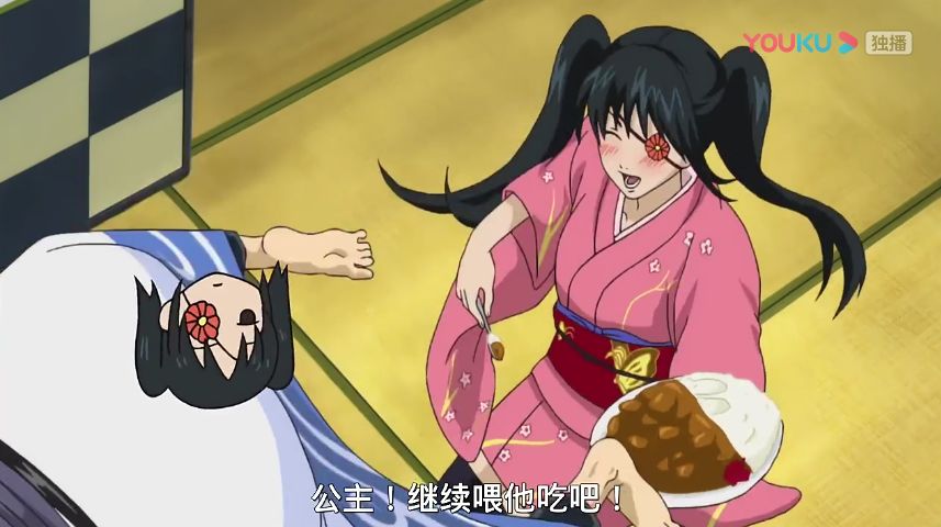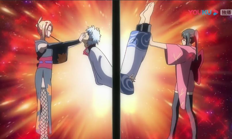 在这一集中银桑约好了要跟月咏和柳生九兵卫一起吃饭,但是这两人都看不惯对方,于是银桑一个冲动就变成这样了…然后银桑还尴尬的说我回来了~然后双方都想要把银桑拉出来,结果就是撕裂的痛!