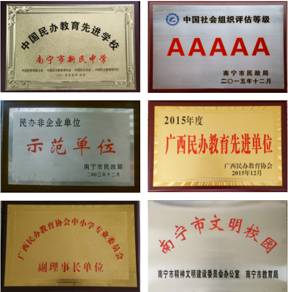 建校以来,先后被评为“中学心理健康教育实验研究先进集体”;“南宁市基础教育课程改革实验先进集体”;“南宁市民办非企业单位示范单位” ;《第二期“广西21世纪园丁工程” 研修基地》;“南宁市民族团结进步创建‘五比五争’活动模范单位(企业)”;“中国民办教育先进学校”、“南宁市民办教育先进单位”、“民办非企业5A等级单位”、“广西民办教育协会中小学专业委员会副理事长单位”;荣获上级教育部门和高等院校定为“中学校长研修基地”、“中学教导主任研修基地”。至今已有100多名优秀新民学子参加了世界级、国家级、区级的各类竞赛决赛,在机器人、体艺、文学、数理等学术比赛中斩获佳绩,充分显示了依托名校办民校的显著优势。