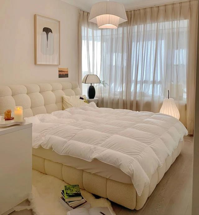 奶白色的乳胶漆墙壁,搭配奶白色的床和床品,让卧室温馨又舒适。