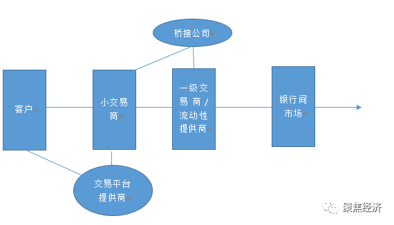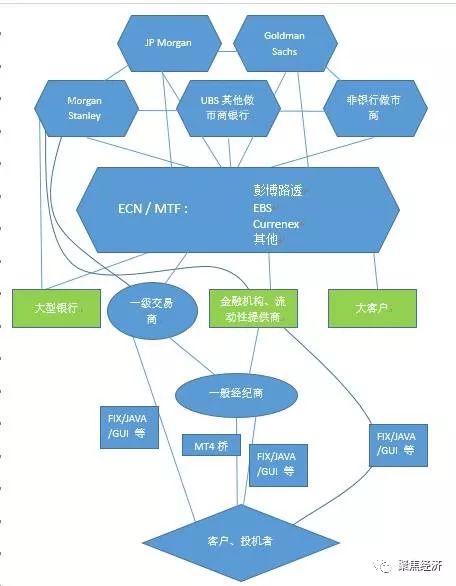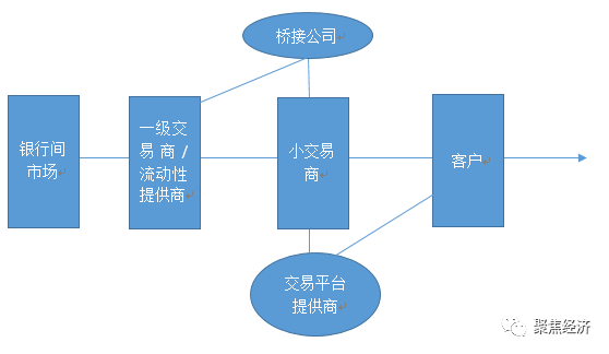 外汇市场主要是报价驱动的,当然也有一些类交易所的指令驱动。报价驱动的价格是从上往下进行传递的。