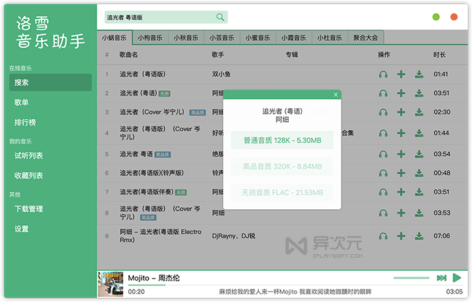 洛雪音乐助手整合了主流音乐平台的接口,除了搜索和在线试听,最重要的它还支持免费下载 mp3文件永久保存 (128Kbps 和高音质的 320Kbps),甚至部分音乐还能支持下载无损音质格式 APE 或 FLAC!