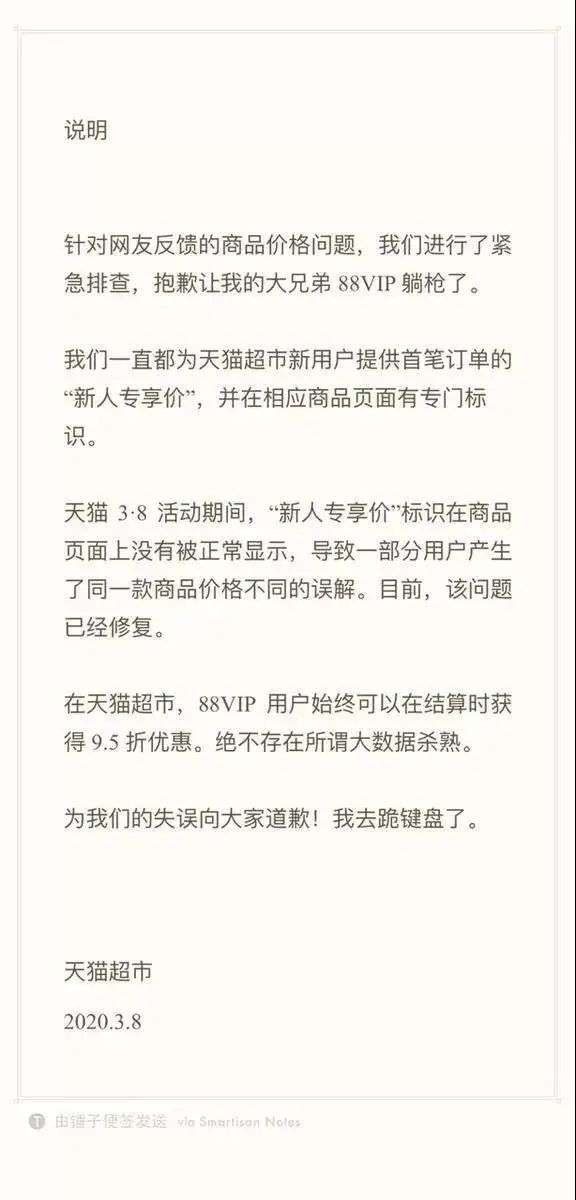 有网友反映,88VIP 会员价格比普通用户高,存在大数据杀熟。天猫超市通过官方微博发文称,针对该问题,已经进行紧急排查,其为新用户提供首笔订单时会有“新人专享价”,并在相应商品页面有专门标识,而天猫 3·8 活动期间,这个标识没有被正常显示,因而产生误解。天猫超市称,目前问题已经解决,并且不存在大数据杀熟的问题。