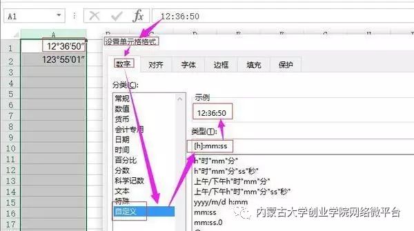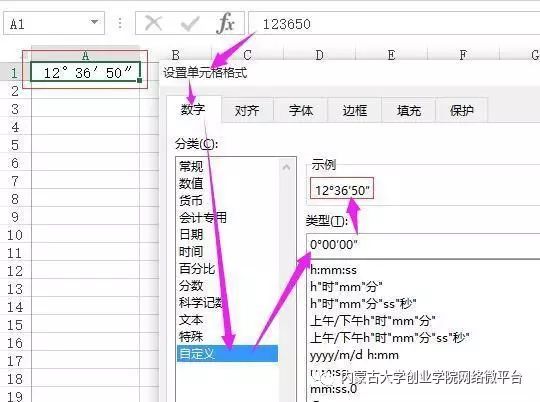 如果角度无负角度的话,可以利用时间格式来定义,因为角度与时间都是60进位制,这样定义的角度,可以参与运算,如:输入“12:36:50”经纬度转换器在线转换度分秒,自定义格式为“[h]°mm′ss″”。