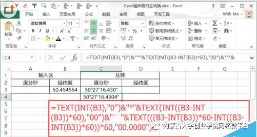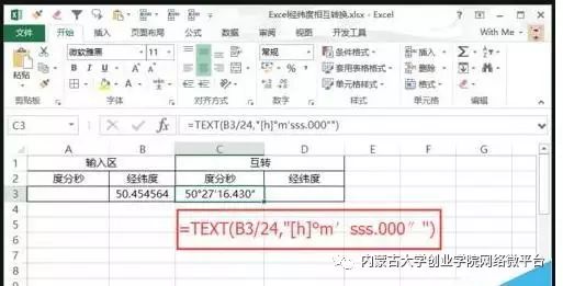 1、录入公式:=TEXT(INT(B3),”0″)&”°”&TEXT(INT((B3-INT(B3))*60),”00″)&”′”&TEXT(((B3-INT(B3))*60-INT((B3-INT(B3))*60))*60,”00.0000″)&”″”