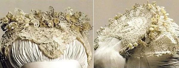 格蕾丝不喜欢凸显身份的皇冠,于是让设计师Helen Rose巧妙地将头纱跟帽饰结合在一起,并在上面绣以花朵和珍珠,显得更为秀丽。