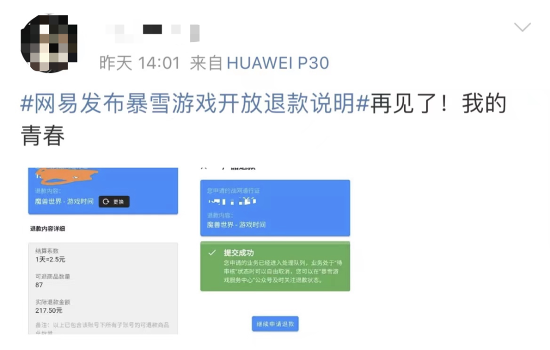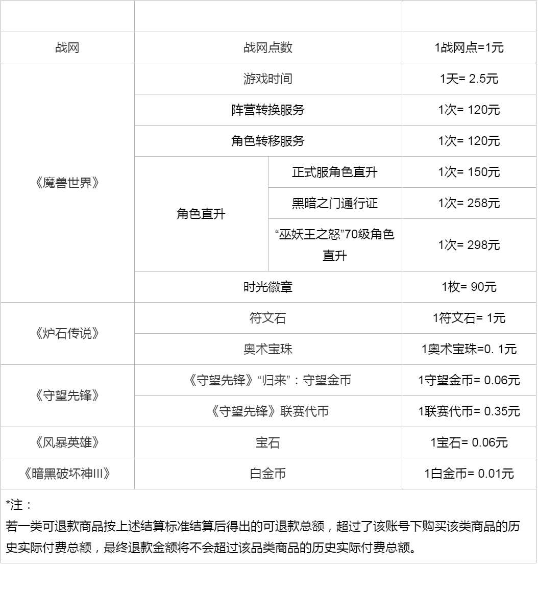 另外,玩家需前往“暴雪游戏服务中心”公众号提交退款申请,最终退款金额将以停运后玩家账号内实际剩余的可退款商品数量为准,且不会超过该账号可退款商品的历史累计付费金额。