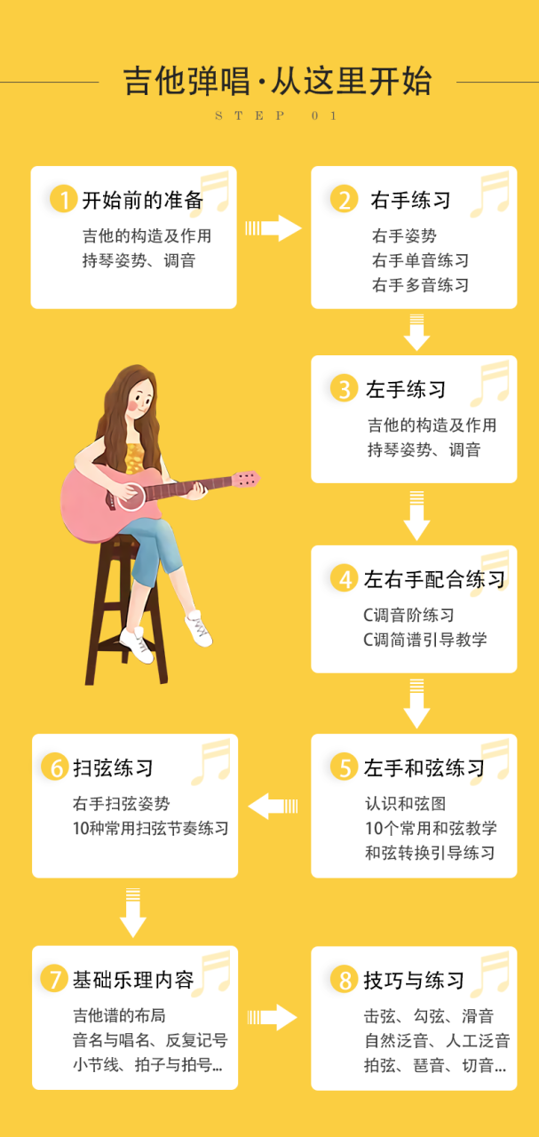吉他弹唱主要是学习吉他伴奏,而吉他伴奏主要是右手分解/扫弦+左手和弦+简单乐理就可以把伴奏弹出来。本套课程为你筛选学习吉他弹唱应该学的全部内容,避免走弯路快速学习吉他。