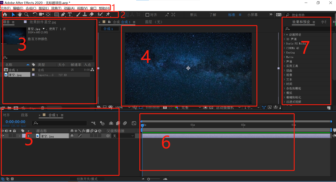 1.菜单栏:文件、编辑、合成、效果、动画、视图、窗口、帮助。
